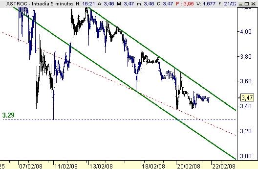 Por abajo, las dos líneas que nos servían de referencia, la línea de apoyo punteada en rojo y la línea inferior de canal verde, se van alejando a la baja. Todavía este alejamiento no es excesivo, y lo mejor para una posible operación sería que durante esta tarde bajaran el precio lo más rápidamente posible para buscar apoyo en ellas.