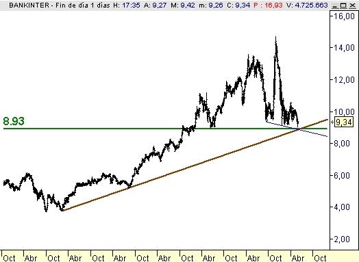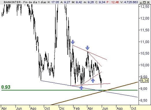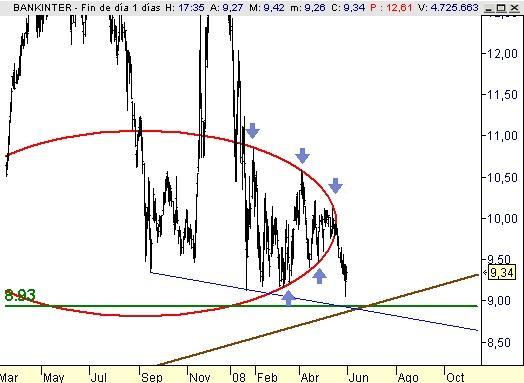 Acercándose a una zona de soporte en 8,90, donde es muy probable ver un rebote de cierta importancia. Máxime cuando dicha zona de soporte coincide con una línea directriz alcista muy importante (marrón) y otra apoyo bajista muy habitual en precios como Bankinter (en azul). Un triple cruce muy importante.