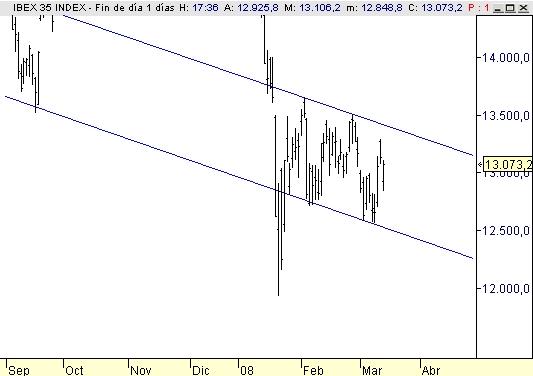 Pese a las escaramuzas que podamos intentar en gráficos de intradía, continuamos con nuestro movimiento lateral, ligeramente bajista. El canal continúa delimitando el precio de forma férrea.